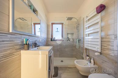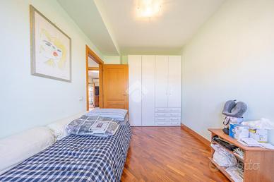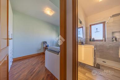 Una camera matrimoniale elegante, con raffinato parquet, e un bagno moderno con box doccia completano questo primo spazio accogliente.