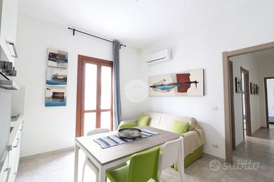 Entrando si accede al soggiorno con angolo cottura, dotato di condizionatore, ambiente reso luminoso dalla presenza della portafinestra con accesso al balcone.