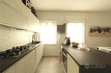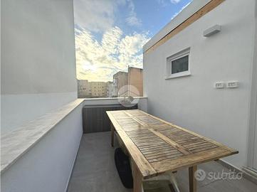A sinistra si trova la cucina, abitabile e molto funzionale grazie alle generose dimensioni, arricchita da un'isola che ne valorizza la praticità. Da qui, tramite una porta finestra, si accede ad un ampio terrazzo abitabile, di 40 mq, ideale per momenti di relax e convivialità all'aperto.