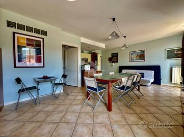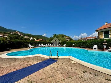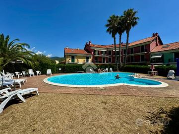 In contesto silenzioso e immerso nel verde, appartamento con piscina condominiale e doppi servizi.