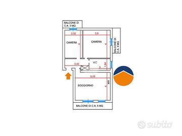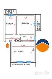 L'appartamento è composto da un luminoso soggiorno con angolo cottura di ca. 21 mq con doppia finestra ed uscita sul balcone.