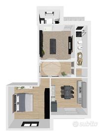 L'ingresso si apre su un ampio corridoio che conduce al salone in cui è presente il primo bagno con doccia ed il balcone con vista aperta sul Castello di Avigliana. Gli spazi abitativi comprendono anche una camera matrimoniale e la cucina abitabile con accesso al secondo balcone A completare la funzionalità dell'appartamento un ripostiglio utilizzabile come lavanderia ed un bagno finestrato in cui è stata studiata un ampia doccia.