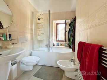 La camera matrimoniale è dotata di un bagno privato finestrato, completo di vasca, sanitari sospesi e finiture eleganti, pensato per offrire massima privacy e comfort.