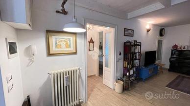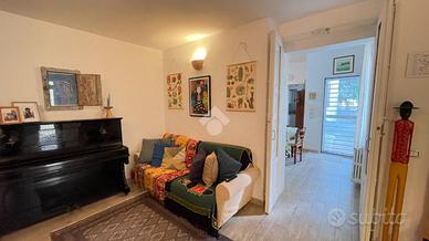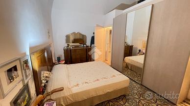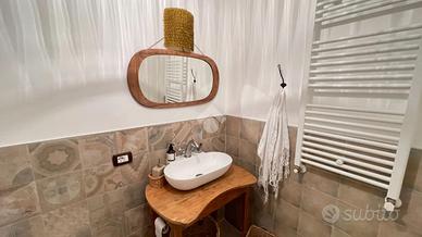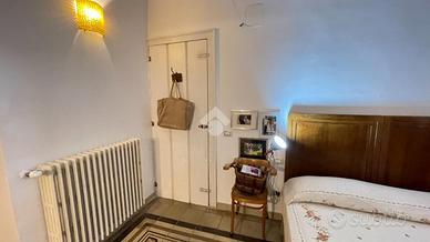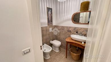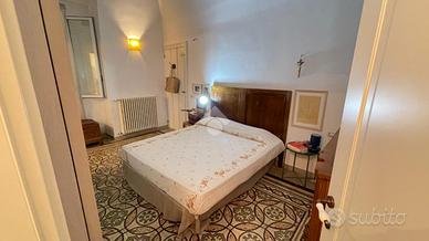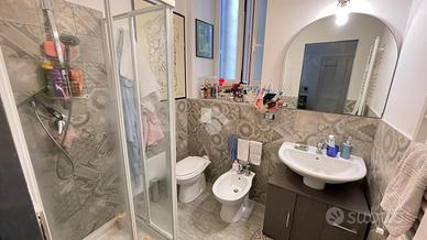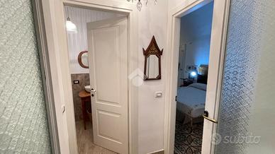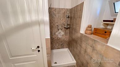 Sul lato destro del soggiorno si sviluppa la zona notte. Questa comprende un primo bagno finestrato con box doccia e una spaziosa camera da letto matrimoniale, impreziosita da pavimentazione in cementine originali, che donano autenticità all'ambiente. La camera è inoltre dotata di un secondo bagno, anch'esso finestrato e con box doccia.