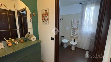 ingresso in disimpegno, bagno padronale con box doccia e vasca, soggiorno con cucina a vista e due uscite esterne sui balconi. Tramite scala interna si accede alla zona notte composta da camera matrimoniale, camera singola e ripostiglio