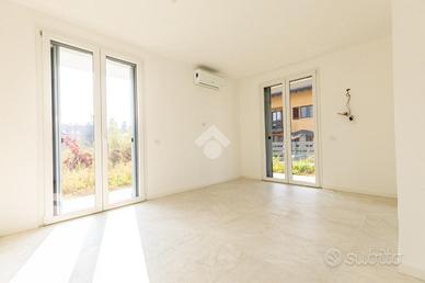 Bergamo - Trilocale con ampio giardino privato in contesto esclusivo In tranquilla e riservata zona residenziale, in strada a fondo chiuso, proponiamo in vendita elegante trilocale al piano terra con giardino privato di 266 mq e porticato coperto, perfetto per vivere momenti di relax all'aperto in totale privacy. L'immobile, di nuova costruzione (2024), si distingue per l'elevata qualità costruttiva e le moderne soluzioni pensate per garantire il massimo comfort abitativo. L'ingresso conduce a un luminoso soggiorno con cucina a vista, valorizzato da ampie vetrate che offrono una piacevole continuità tra interno ed esterno. La zona notte comprende due camere da letto e due bagni finestrati, entrambi rifiniti con materiali di pregio. Le finiture, con porte interne e serramenti in tonalità bianca, donano agli ambienti uno stile contemporaneo, elegante e luminoso. Dotazioni: * Riscaldamento autonomo a pavimento * Aria condizionata * Classe energetica A2A completare la soluzione due comodi box per la massima praticità in aggiunta al prezzo (24 mq e 22 mq), ideali anche come spazio hobby o deposito. Soluzione ideale per chi cerca tranquillità, indipendenza e modernità, a pochi minuti da Bergamo.