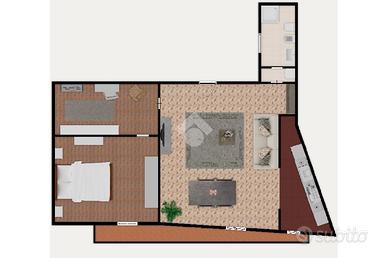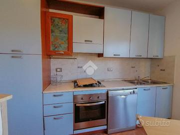 Entrando, si accede alla zona giorno composta dalla cucina a vista sul luminoso soggiorno, con uscita sul balcone della soluzione. La zona notte è formata da una camera matrimoniale, un'ulteriore stanza, sfruttabile come locale hobby, cambia armadio, studio o eventualmente camera da letto singola, ed un bagno con doccia. Al piano terra completa la proprietà un box singolo.
