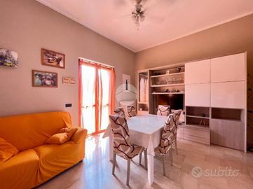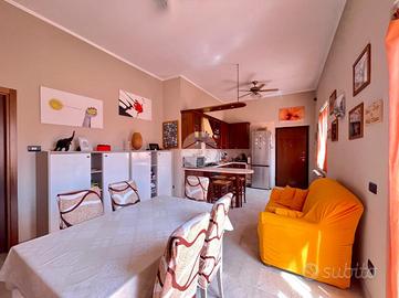 A destra troviamo la porta blindata che ci immette direttamente nella zona giorno. Il living è caratterizzato da una cucina a vista disposta su due lati, con penisola a sbalzo. L'ambiente è molto luminoso, orientato a sud, anche grazie alla porta finestra del soggiorno.