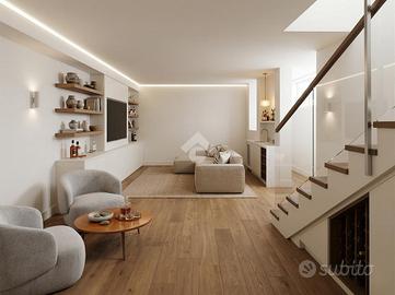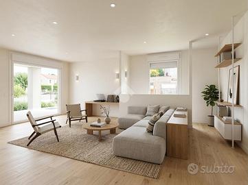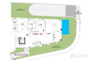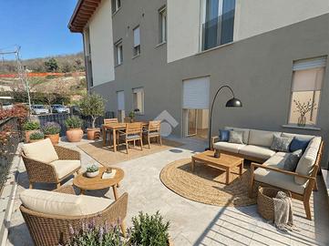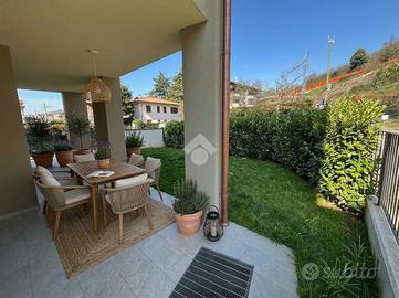 MOMPIANO In zona tranquilla, proponiamo in vendita esclusivo appartamento di nuova costruzione posto al piano terra valorizzato dal giardino di proprietà. Il contesto abitativo è composto da sole 4 unità abitative ed è dotato di ascensore. L'immobile si trova al piano terra ed è dotato di un'ampia area esterna di pertinenza che circonda l'appartamento sui suoi 3 lati liberi, parzialmente pavimentata e parzialmente coperta. L'ampia zona giorno è con cucina a vista e si affaccia sul portico esterno. Due le camere da letto di cui una con bagno privato e cabina armadio. Un secondo bagno finestrato completa il piano. Tramite una scala interna si accede all'ampia taverna caratterizzata da un terzo servizio ed una zona lavanderia. Di pertinenza esclusiva garage doppio in larghezza al piano seminterrato con basculante elettrica. L'immobile è dotato di ventilazione meccanica controllata, riscaldamento a pavimento ed aria condizionata in ogni stanza. Immobile in classe A valorizzato dalle finiture di pregio che possono essere personalizzate in base al capitolato. Le immagini arredate sono render realizzati a scopo illustrativo, pensati per valorizzare gli spazi e suggerirne il potenziale. L'immobile viene venduto privo degli arredi rappresentati.