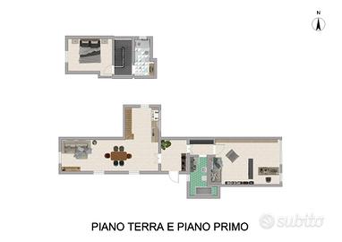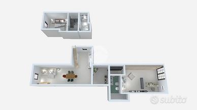 Distribuito su due livelli, l'appartamento offre un' accogliente zona giorno al piano terra. Qui, l'angolo cottura è perfettamente integrato con il salotto, creando uno spazio aperto e versatile per momenti di convivialità e relax. Completa il piano un elegante bagno finestrato e una stanza multiuso, ideale come studio, area hobby o camera per gli ospiti.