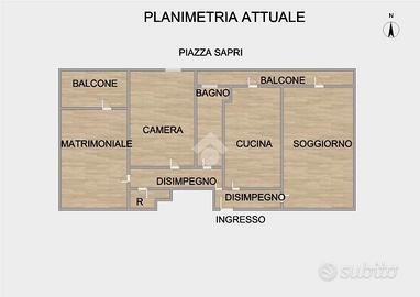 È un 3 vani e si sviluppa su una superficie lorda di 90 mq circa più i balconi. Disimpegno all'ingresso divide il salone ampio dal tinello, entrambi con affaccio sulla famosa Piazza Sapri.