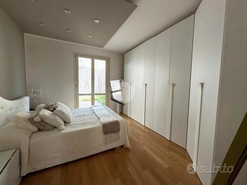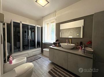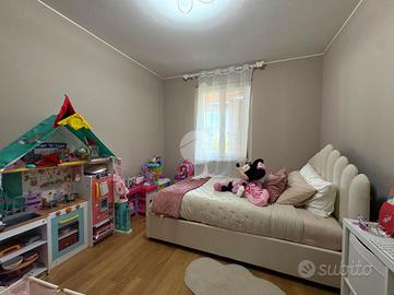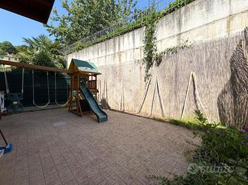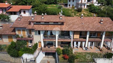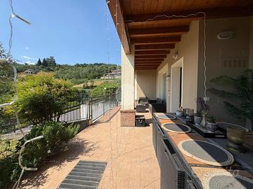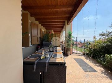 TRILOCALE CON GIARDINO L'appartamento è inserito all'interno di un complesso condominiale composto da sei unità abitative edificato nell'anno 2010 ed in ottime condizioni abitative. Ubicato al primo piano di due, l'accesso all'immobile avviene attraverso la percorrenza di una scalinata comune ad altre due unità abitative che conduce ad un ingresso indipendente attraverso un loggiato di circa 20 mq ed un giardinetto fronte casa. L'appartamento si presenta in ordine e ben mantenuto con pavimenti in gres effetto parquet studiati per la zona giorno e bagno e parquet originale per le camere. La soluzione è composta da una luminosa zona living di circa 30 mq con cucina a vista. Nella zona notte troviamo un disimpegno che conduce ad una camera matrimoniale, una camera singola ampia, un ripostiglio ed un servizio igienico finestrato con box doccia multi funzionale. La camera da letto gode di uno sfogo diretto sul giardino sul retro, completamente piastrellato e con un comodo attacco per la lavatrice esterno. Gli infissi, con doppi vetri in legno, sono ben tenuti. Il riscaldamento è autonomo a pavimento, ed è presente all'interno dell'abitazione una stufa a pellet. Non è presente impianto di climatizzazione in quanto la posizione panoramica ed in mezzo al verde concede di non doverne usufruire. A completare un box auto di circa 18 mq con attacchi per la lavatrice. Le spese di gestione condominiale ammontano a circa 60 euro l'anno, comprendono luci scale e elettricità per l'accesso ai box.