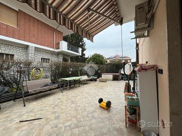 L'immobile è circondato sui tre lati da un giardino terrazzato molto curato, completo di tende da sole e tettoia coperta per posti auto.