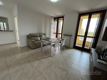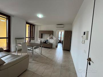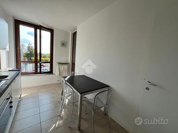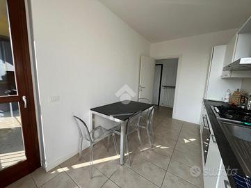 Ingresso in ampia e luminosa zona living composta dal soggiorno con accesso diretto, tramite porta finestra, al terrazzino loggiato completo di zanzariere e cucina abitabile.