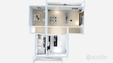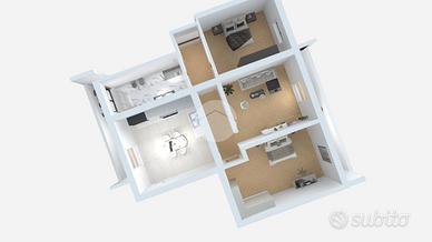 L'immobile, sviluppato su un unico livello abitativo, presenta l'ingresso su soggiorno con cucina a vista e sfogo sul balcone. Tramite disimpegno si accede alla zona notte composta da un'ampia camera matrimoniale con accesso al secondo balcone, cameretta, ripostiglio e bagno finestrato dotato di box doccia e vasca. Possibilità di ricreare terza camera.