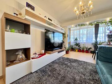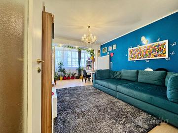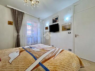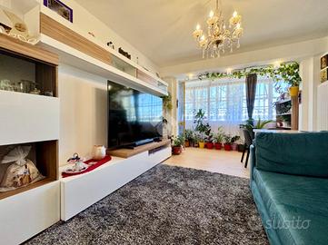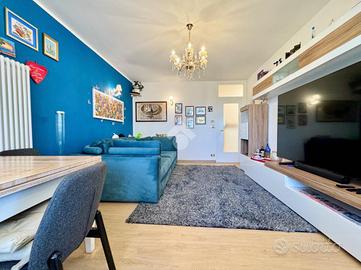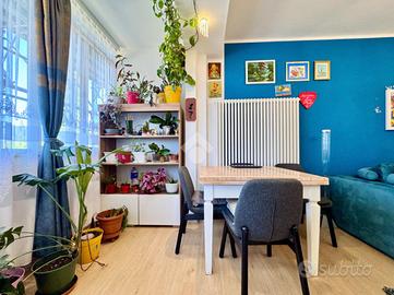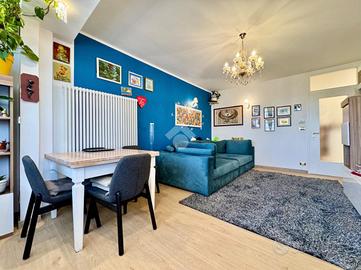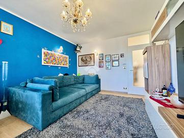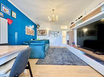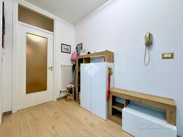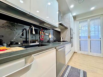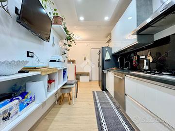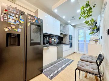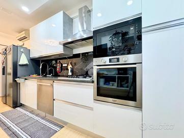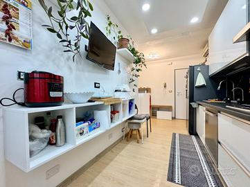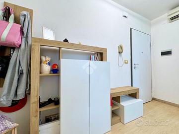 L'accesso principale affaccia in un atrio nel quale trova spazio subito la cucina a vista con affaccio sul terrazzo, funzionale per riporre tutti gli oggetti utili per la raccolta differenziata.