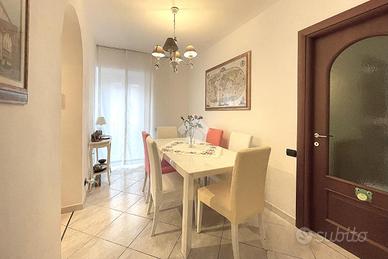 Adiacente al soggiorno si trova una stanza adibita a sala da pranzo, collegata tramite un disimpegno alla cucina abitabile e ad un locale servizi finestrato, e munito di box doccia.