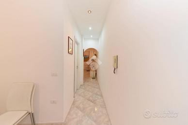 Il disimpegno conduce al bagno e alla cucina abitabile. Questa ha due punti luce di cui una portafinestra ampia che da anch'essa accesso al balcone chiuso.