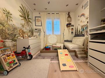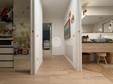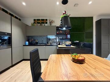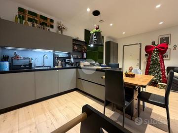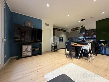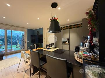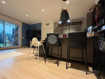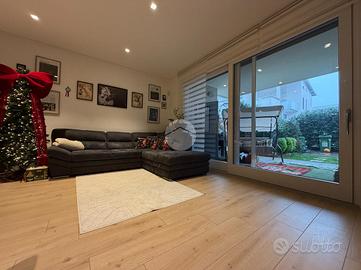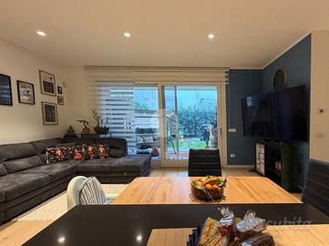 Appartamento con giardino in Classe A3 - recente costruzione 2023 In elegante contesto residenziale di recentissima costruzione (2023), in Classe Energetica A3, proponiamo in vendita splendido appartamento con giardino, situato in zona tranquilla e residenziale, a pochi passi dal centro del paese e comodo a tutti i principali servizi. L'abitazione si apre su un'ampia e luminosa zona giorno, composta da cucina con bancone all'americana e una confortevole area relax con grande divano. Una vetrata scorrevole di generose dimensioni conduce direttamente al portico coperto e al giardino privato, curato e ben sfruttabile, che circonda la casa su due lati. Dal soggiorno si accede alla zona notte, ben separata da un disimpegno, dove troviamo: * due camere da letto, di cui matrimoniale con bagno privato; * bagno padronale con vasca; * comodo ripostiglio interno. L'immobile è dotato di tutti i comfort di ultima generazione, tra cui: * impianto di domotica per la gestione di luci, tapparelle elettriche, riscaldamento e aria condizionata canalizzata; * impianto di videosorveglianza e antifurto perimetrale e volumetrico; * infissi in PVC con doppio vetro, zanzariere su tutte le finestre; * porta blindata e videocitofono; * pratico ripostiglio esterno. Gli interni sono stati curati nei minimi dettagli, con materiali di pregio e uno studio razionale degli spazi e dell'illuminazione. La pavimentazione è uniforme in effetto parquet in tutta la casa, conferendo eleganza e continuità agli ambienti. La proprietà gode di doppio accesso: dal pianerottolo condominiale e direttamente dal cancelletto privato del giardino. Completano la soluzione: * box auto e cantina inclusi nel prezzo; * l'immobile viene venduto parzialmente arredato, con cucina completa con piano di lavoro in quarzo e camera matrimoniale su misura. Soluzione ideale per chi cerca una casa moderna, efficiente e pronta da vivere, senza rinunciare alla comodità del centro e allo spazio esterno.