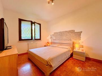 L'ingresso è completamente indipendente e avviene tramite un comodo cancelletto su strada, che apre direttamente sull'ampio giardino privato, ben curato e completamente piantumato. Lo spazio esterno è arricchito da un porticato, perfetto per vivere momenti di relax o convivialità all'aria aperta durante la bella stagione.