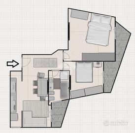 L'appartamento è così composto: ingresso, soggiorno con cucina e balcone, due camere collegate da un ampio balcone con vista panoramica, e bagno finestrato.