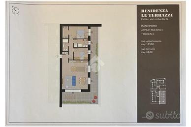 Ampio trilocale al piano primo composto da soggiorno open space con cucina a vista, doppi servizi, camera matrimoniale spaziosa e molto luminosa e cameretta.