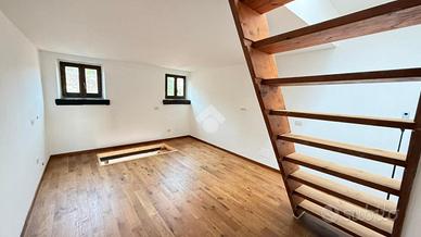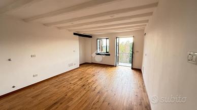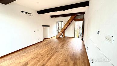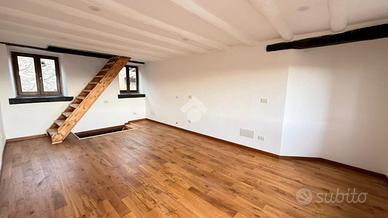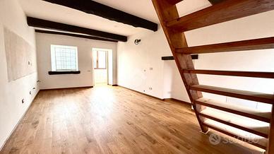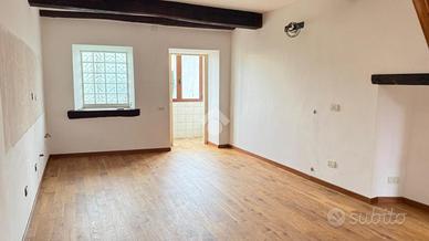 Varcando l'ingresso indipendente, si viene accolti da una calda zona giorno con travi in legno a vista, uno spazio intimo e raccolto dove immaginare colazioni lente e serate conviviali. Il piccolo balcone affacciato sulla piazza regala scorci di vita del borgo, completa il piano un bagno finestrato con doccia.