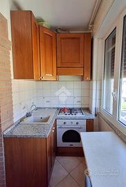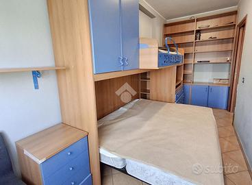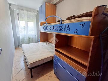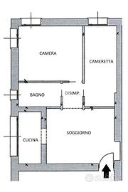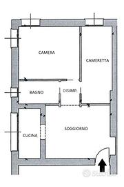 L'abitazione, posta al secondo piano, è composta da soggiorno, cucinotto, disimpegno notte con una camera matrimoniale, una cameretta e un bagno finestrato con vasca e lavatrice.