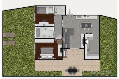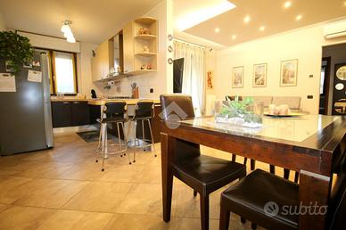 Dall'ingresso principale si accede all'ampio salone con cucina a vista valorizzata da abbassamenti in cartongesso con faretti, con l'uscita sul giardino e sul portico.