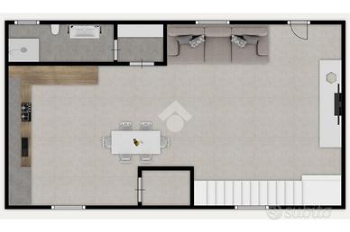 Al piano terra si sviluppa la zona giorno, composta da soggiorno con cucina a vista e da un bagno finestrato con piatto doccia.