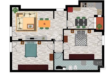 L'ingresso all'abitazione è diretto nel soggiorno, ambiente separato dalla cucina abitabile con accesso ad un piccolo balcone loggiato con vista sul verde. Nel reparto notte sono distribuite le due camere da letto matrimoniali e il bagno dotato di doccia.