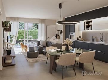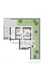Mostriamo la maisonette con giardino privato sui 2 lati così composta: ingresso in soggiorno con cucina a vista, disimpegno notte, 2 camere da letto matrimoniali e 2 bagni. Garage e posto auto di proprietà.