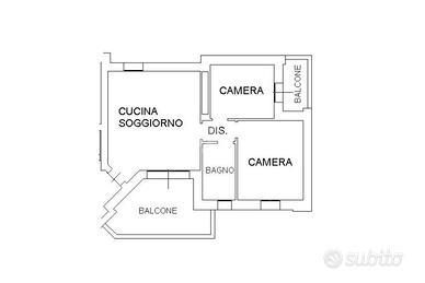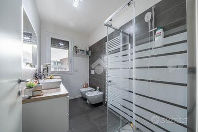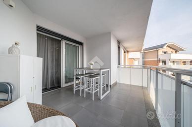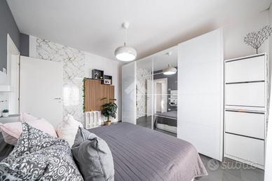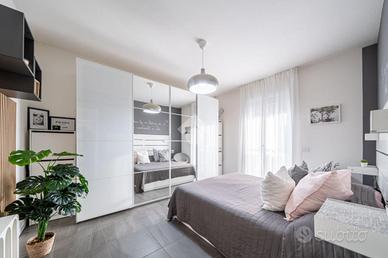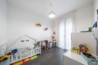 L'appartamento è situato al 2° piano con ascensore ed è così composto: soggiorno con cartongesso e sistema di illuminazione integrata, cucina a vista e terrazzino, disimpegno notte, camera matrimoniale, camera singola con balcone e bagno. Completa la soluzione il garage doppio nell'interrato.