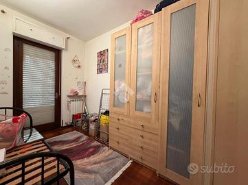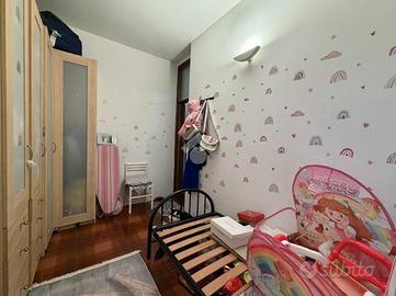 Accesso da portoncino che affaccia sul soggiorno con cucina a vista ed uscita sul balcone; a seguire troviamo il disimpegno che ci porta nella zona notte, composta da bagno accessoriato con vasca, camera matrimoniale e cameretta con seconda uscita sul balcone.