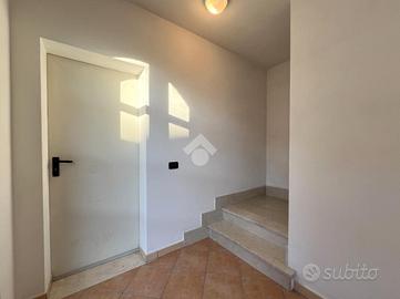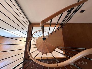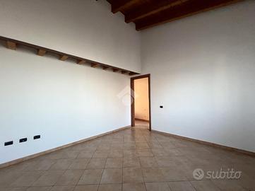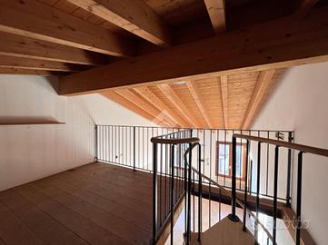 L'ingresso si apre su una luminosa zona giorno con cucina e soggiorno in open space, valorizzato da soppalco e travi a vista in tonalità marrone, elementi che donano calore e carattere all'ambiente.