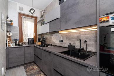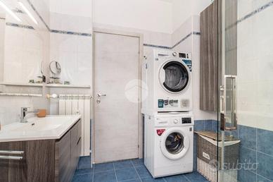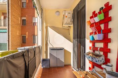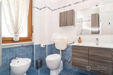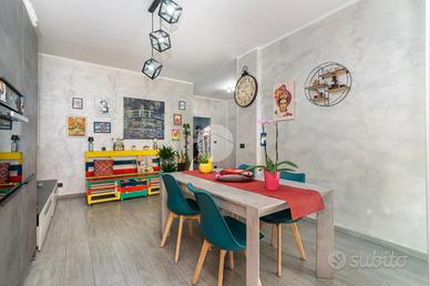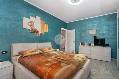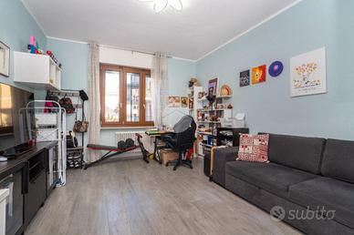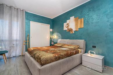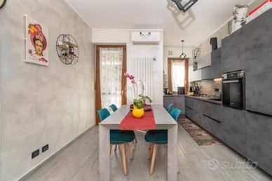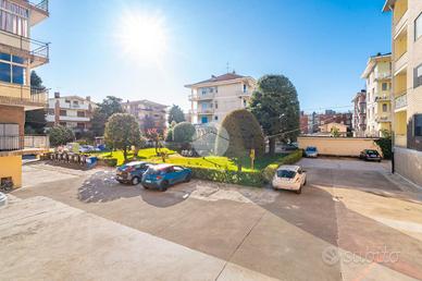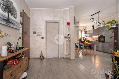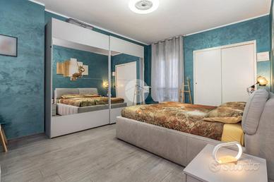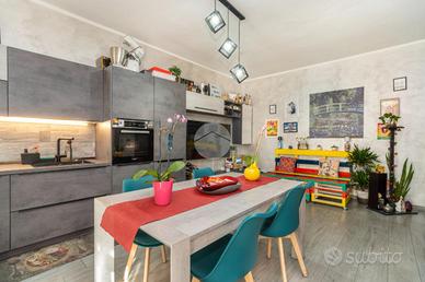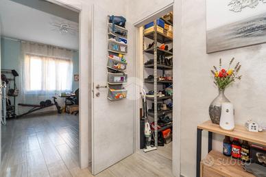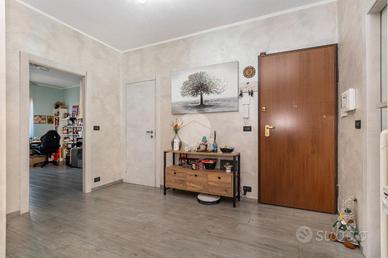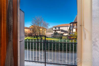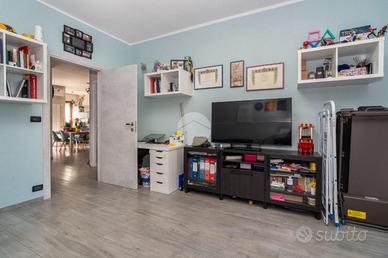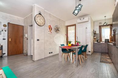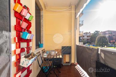 L'alloggio si trova al primo piano di una palazzina degli anni '70 dotata di ascensore e sita in una zona centrale del paese, quindi comoda a tutti i servizi, come la fermata dell'autobus, il centro commerciale e la stazione. L'appartamento è stato rivisto totalmente nel 2019 con rifacimento degli impianti elettrici, sostituzione dei pavimenti, delle porte interne ed ampliamento della zona giorno precedentemente divisa tra cucinotto e tinello. Lo stabile ha usufruito del bonus ristrutturazioni per il rifacimento degli infissi. Dal portoncino blindato si accede all'ampia zona giorno che attualmente ospita una parete lineare per la cucina, un tavolo e la zona relax con divano e parete attrezzata per la tv. Da questo ambiente si accede al balcone con affaccio sul cortile condominiale. Il disimpegno che collega tutte le stanze da accesso alle due camere da letto, di cui una dotata di balcone con tende estive ed invernali, al bagno finestrato con doccia e zona lavanderia e ad un comodo ripostiglio. Ogni ambiente risulta molto luminoso grazie alla doppia esposizione. La cantina, il box auto a livello strada ed il posto auto assegnato completano la proprietà.