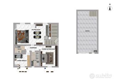 Appena varcata la soglia, sarete accolti da un ampia zona giorno open space impreziosita da un camino. Dalla cucina, una scala conduce a uno spazioso garage, attualmente adibito anche a zona lavanderia.