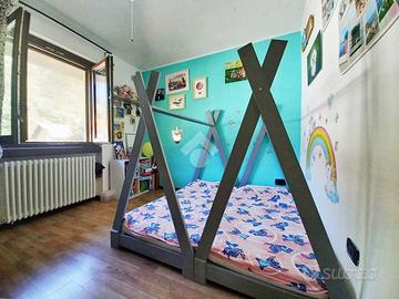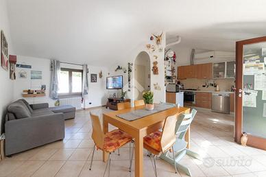 Conf. CANZO - TRILOCALE MANSARDATO, RISTRUTTURATO, CON POSTO AUTO COPERTO L'immobile sorge sul confine con il comune di Canzo, in un caratteristico contesto ricavato dal recupero di un antico cascinale, disposto a ferro di cavallo su di una corte ordinatamente pavimentata e ben soleggiata. L'aspetto rustico delle facciate, la pietra, i mattoni a vista e gli ampi loggiati con balaustre in legno, rimandano all'origine rurale del complesso, riqualificato a fine anni '70 e sottoposto al rifacimento del tetto nel 2018. L'appartamento, completamente ristrutturato nel 2013, è collocato al secondo piano mansardato ed è libero su tre lati: quello d'ingresso, affacciato sulla corte, è dotato di un balcone coperto di 7 mq con eccellente esposizione a sud-ovest. All'interno si compone di un'accogliente zona giorno con cucina a vista ed affaccio sul balcone, un disimpegno di accesso alla zona notte, due camere da letto, un bagno finestrato ed un pratico ripostiglio. L'impianto di riscaldamento è autonomo a metano, dotato di radiatori tubolari ed alimentato da caldaia a condensazione. Tutte le finiture sono state rinnovate con la recente ristrutturazione interna e presentano pavimentazioni e rivestimenti in ceramica a posa diagonale (per la zona giorno ed il bagno) e laminato effetto legno nelle due camere. Il bagno è dotato di sanitari sospesi e di comodo box doccia. I serramenti sono provvisti di vetrocamera, zanzariere ed antoni esterni in legno (blindati per la zona giorno). Tra le ulteriori dotazioni vi sono l'impianto di condizionamento con funzione caldo-freddo e la tenda parasole sul balcone. L'unità abitativa dispone di un posto auto coperto privato nell'adiacente area condominiale dotata di accesso carraio con cancello automatizzato; all'esterno è invece presente un comodo parcheggio pubblico. L'immobile si presenta in ottimo stato ed è caratterizzato da spese condominiali particolarmente contenute. La posizione strategica, sul confine con Canzo, consente
