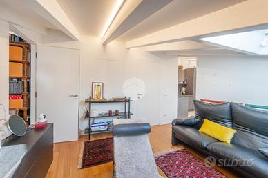 La moderna zona giorno ci accoglie una cucina su misura firmata CAPPELINI, realizzata con finiture di design che si integrano perfettamente nell'ambiente e con un' elegante pavimentazione in bamboo presente anche nelle due camere da letto.