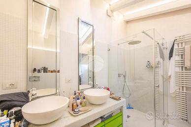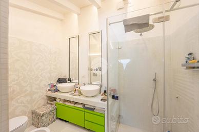 Un punto di eccellenza è il bagno, completamente nuovo di Bisazza, dove spicca un ampio lavabo in resina elegantemente installato su un piano in marmo, in un ambiente rifinito con mosaici a parete.