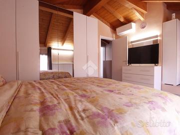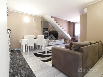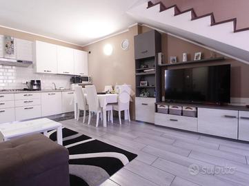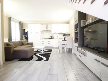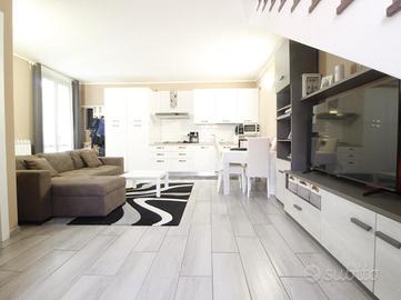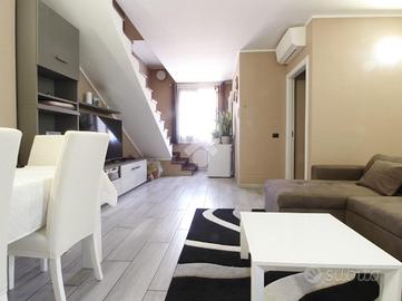Cerro Maggiore. Finiture moderne e ed eleganti, spazi confortevoli e funzionali queste alcune delle principali caratteristiche che presenta l'immobile che proponiamo. L'appartamento si trova al primo piano: ingresso nel soggiorno che si integra perfettamente con la cucina. Con doppia esposizione e balcone, disimpegno e 1° bagno grande con doccia. Al 2° piano, raggiungibile con una comoda scala in muratura si arriva nella zona notte. Gli ambienti hanno il soffitto con travi in legno a vista: spaziosa camera matrimoniale, cameretta con balcone e velux e 2° bagno, anch'esso completo di doccia. L'appartamento è dotato di finiture di qualità e di impianti moderni, assicurando un elevato standard abitativo. Il prezzo comprende: box, cantina, climatizzatori e l'arredamento. La palazzina del 2009 ha una buona gestione condominiale e basse spese.