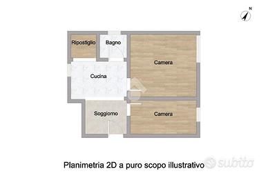 L'immobile vede la seguente distribuzione interna: cucina abitabile, soggiorno, due camere da letto, bagno finestrato con box doccia e infine un ripostiglio.