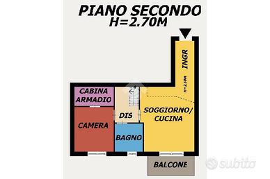 Al Piano Secondo troviamo un ampio Ingresso, Soggiorno con Cucina a Vista e Balcone, Camera da Letto con Cabina Armadio e Bagno;