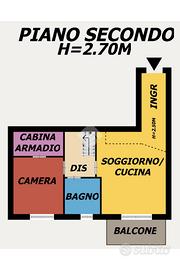 Al Piano Secondo troviamo un ampio Ingresso, Soggiorno con Cucina a Vista e Balcone, Camera da Letto con Cabina Armadio e Bagno;