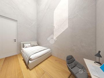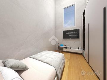Successivamente il corridoio ci indirizza verso la zona notte, dove troviamo la camera matrimoniale di 17,59 mq e la cameretta di 12,39 mq. Una delle due camere ha una porta finestra verso il terzo balcone.