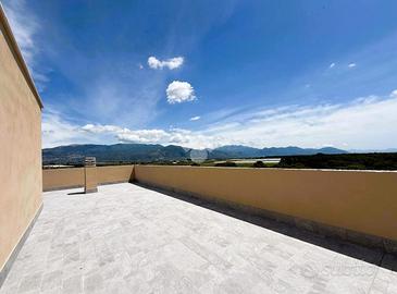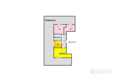Varcato il primo portoncino troviamo il soggiorno con la prima porta finestra che consente l'uscita sull'ampio terrazzo. Mentre, separata da un tramezzo, troviamo la cucina abitabile, anch'essa con porta finestra per l'uscita verso lo sfogo esterno.