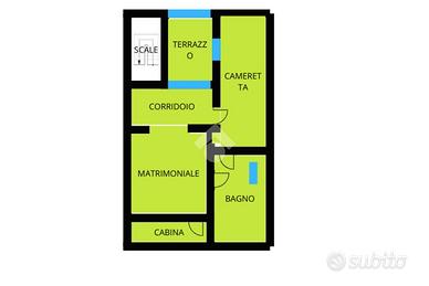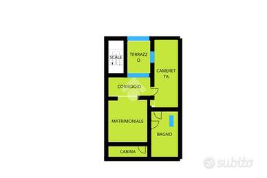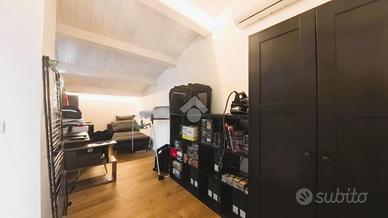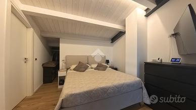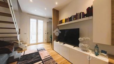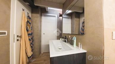 Il duplex con scala interna, ha, al piano secondo servito da balcone, la zona living, dove si distinguono un area lounge dalla cucina con tavolo da pranzo ed un bagno di servizio con doccia; al piano mansardato è presente la matrimoniale con alle spalle una cabina armadio privata, una cameretta ed un bagno finestrato con doppio ingresso; sempre al piano, un terrazzino a tasca utilizzato come spazio tecnico/lavanderia.