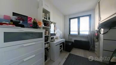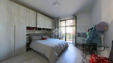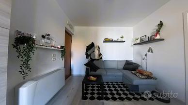 L'ingresso dell'appartamento è sul soggiorno open space con angolo cucina, molto luminoso e con accesso sul balcone; dal disimpegno raggiungiamo le due camere da letto, una matrimoniale con balcone e una cameretta, bagno finestrato con box doccia, al piano S1 garage di 20 mq.