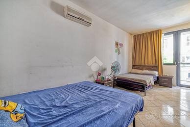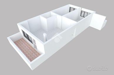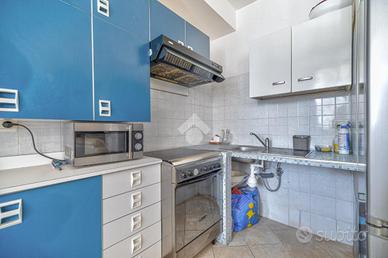 L'ingresso conduce a un soggiorno con angolo cottura in open space, con accesso diretto al balcone vista mare. La zona notte, ben separata, ospita due camere matrimoniali, di cui una con accesso al secondo balcone affacciato su via Bramante. Il bagno è cieco e dotato di box doccia.