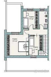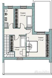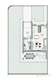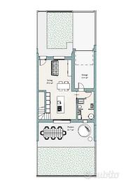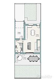 La prima tipologia di villa su due livelli è composta al piano terra da zona giorno con sala da pranzo e cucina abitabile, disimpegno e bagno finestrato con lavanderia. Dal luminoso soggiorno si accede direttamente al fronte del giardino mentre dalla cucina si accede al portico esclusivo. Il piano primo si sviluppa con camera matrimoniale, due camere singole e bagno finestrato. A completare la proprietà box auto e posto auto esterno scoperto. Giardino libero su tre lati per la soluzione di testa di sinistra e giardino fronte e retro per le soluzioni centrali.